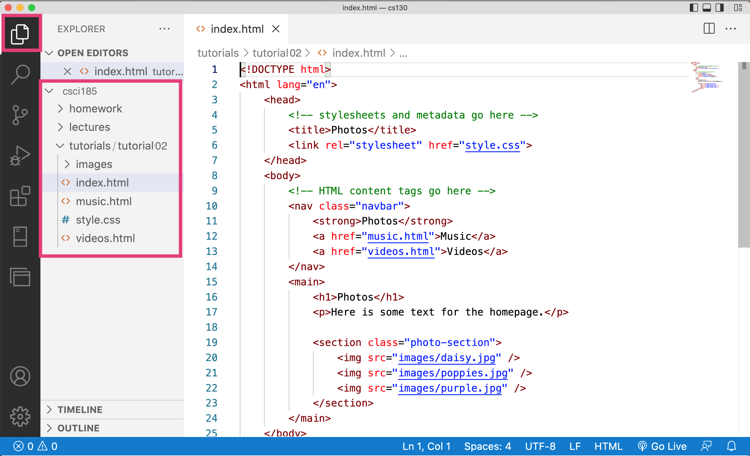 After you’ve doublechecked your file structure, open your entire csci185 folder in VS Code. Your file list should look like this (click on the icon that looks like two pieces of paper in the upper left-hand corner of your screen):