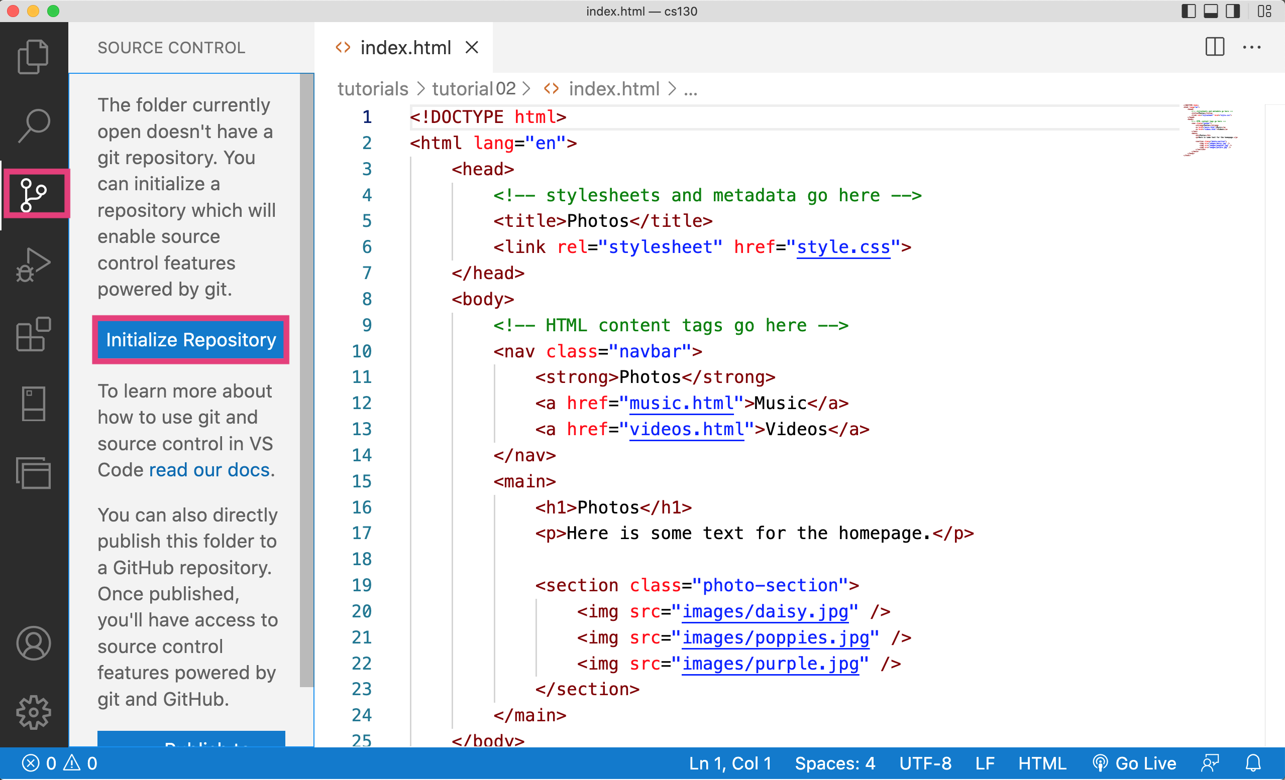 Next, click on the icon that looks like a tree branch, and click the blue button that says “Initialize Repository”: