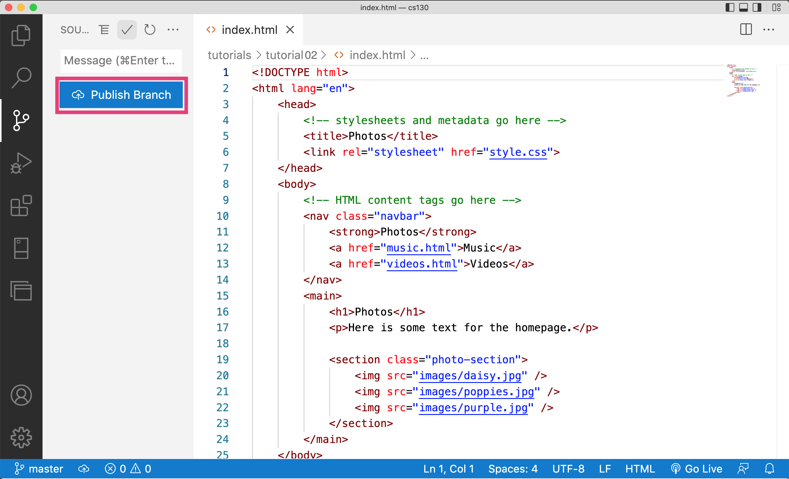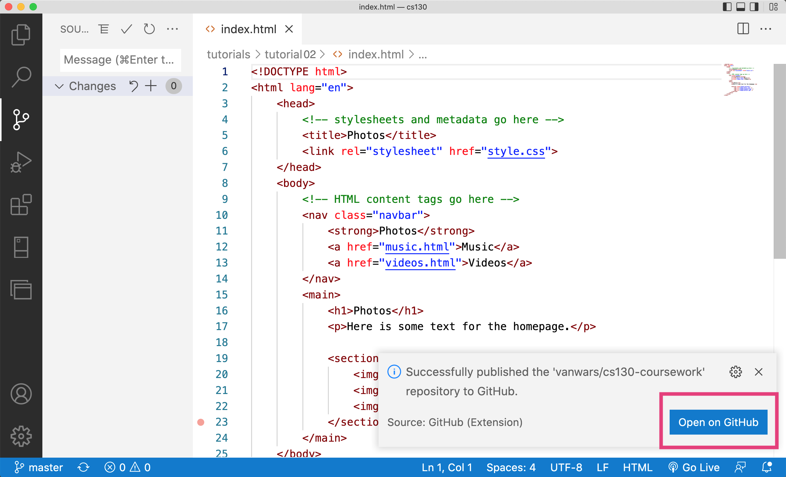 Today, you will be publishing the web page you made in tutorial02 to GitHub. To do this, please complete the following: