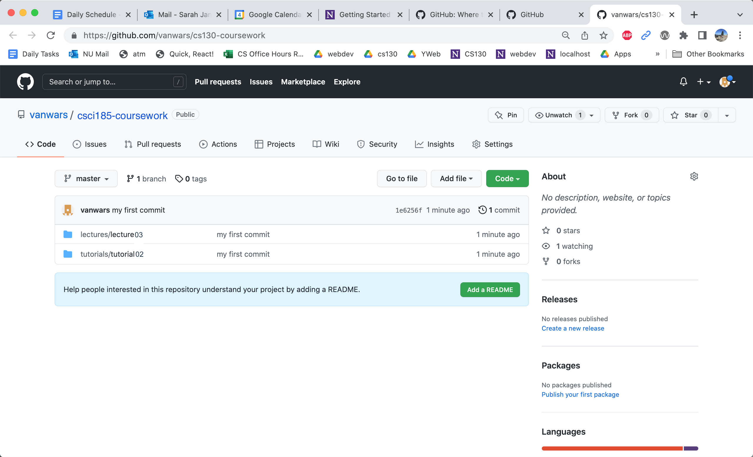 Clicking the button will open your newly created csci185-coursework repository and show you all of your files (which are now in the cloud):