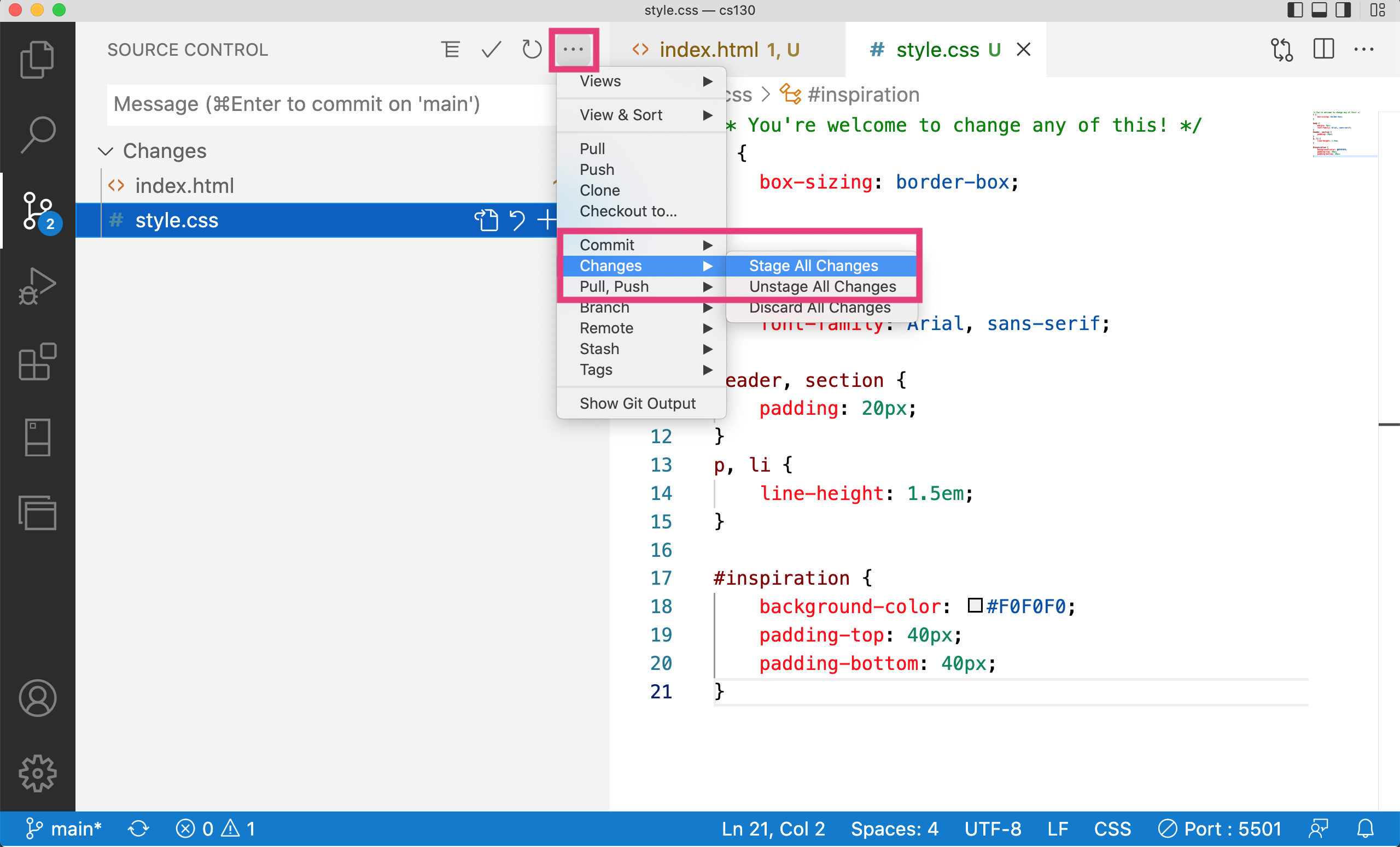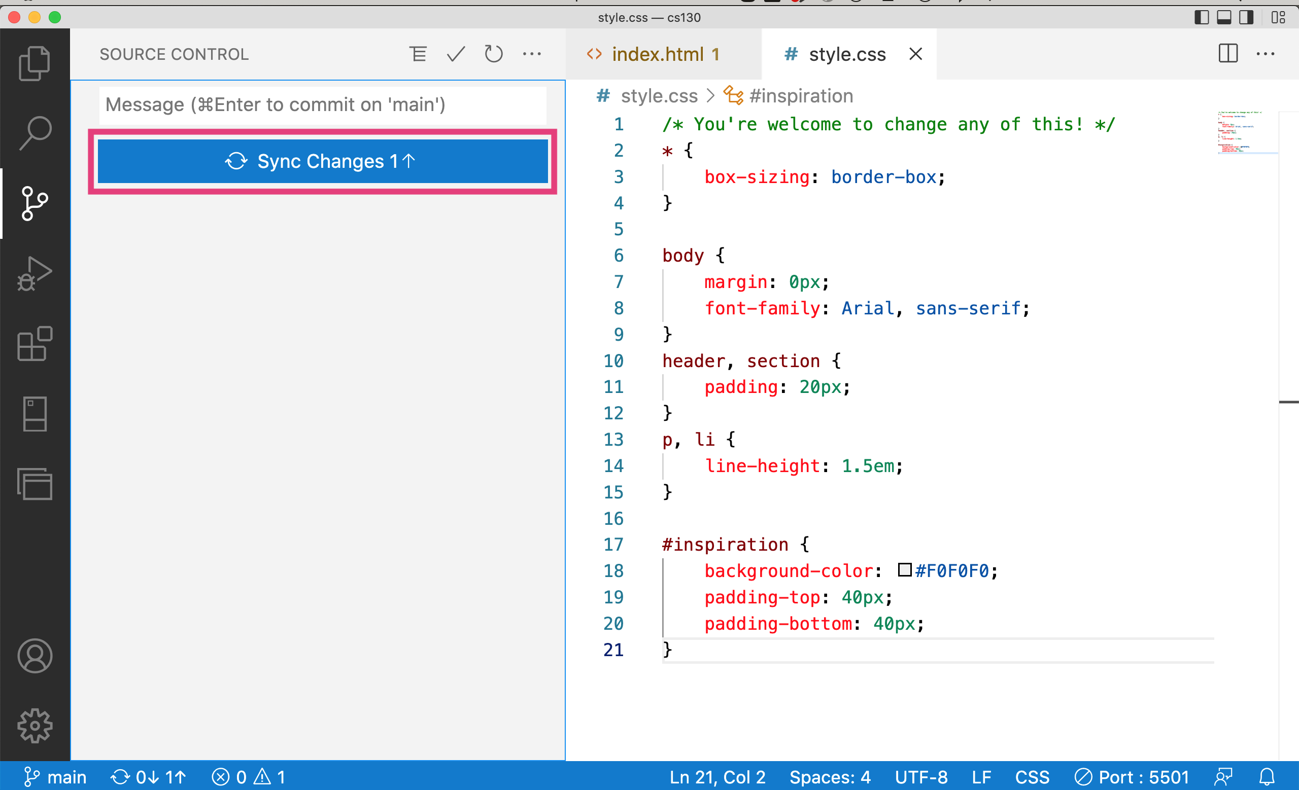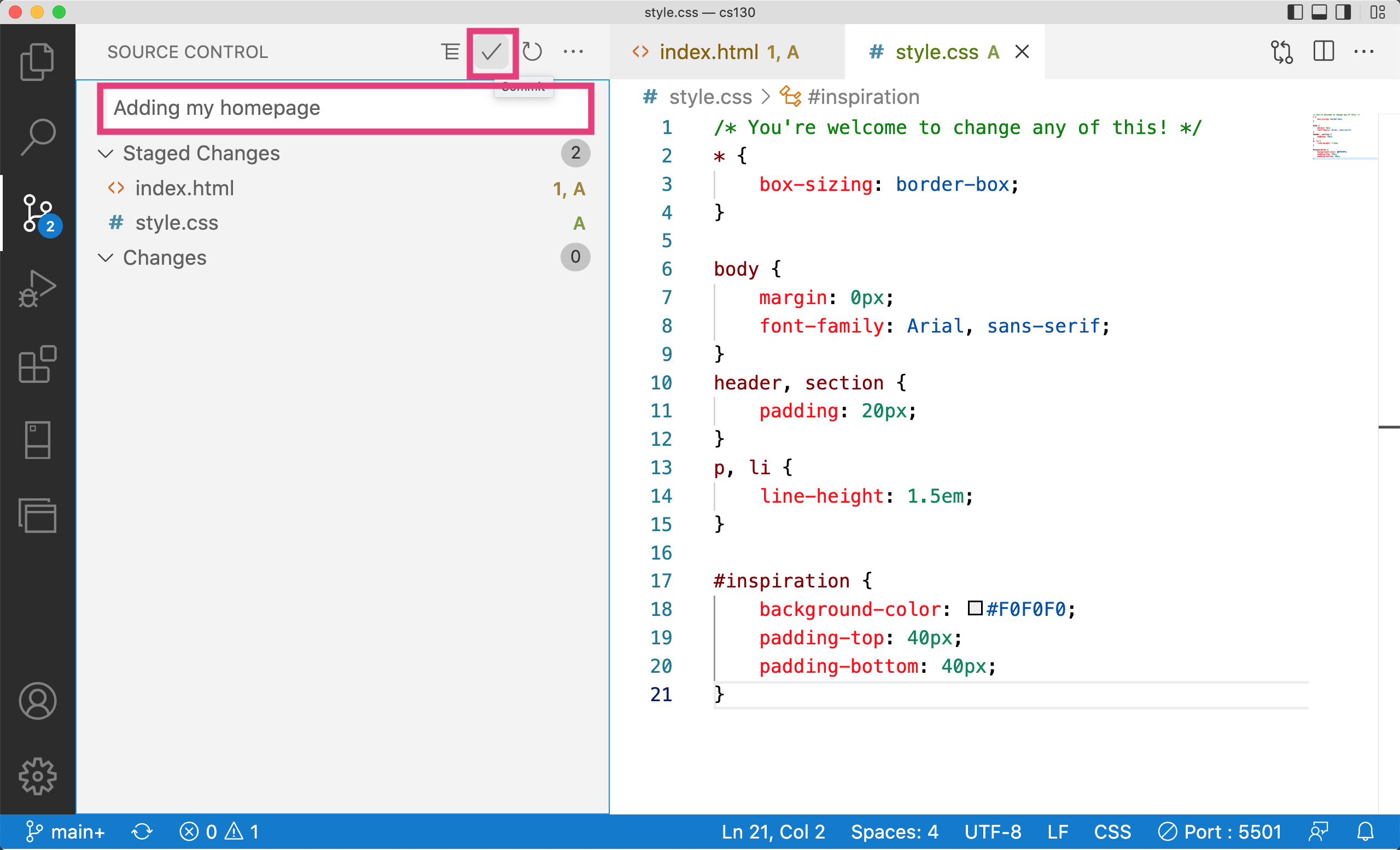 Once you’ve set up your two new files, go ahead and commit everything and push your new files to GitHub. This will involve (1) “staging” all of your changes, (2) committing them, and (3) syncing them.
